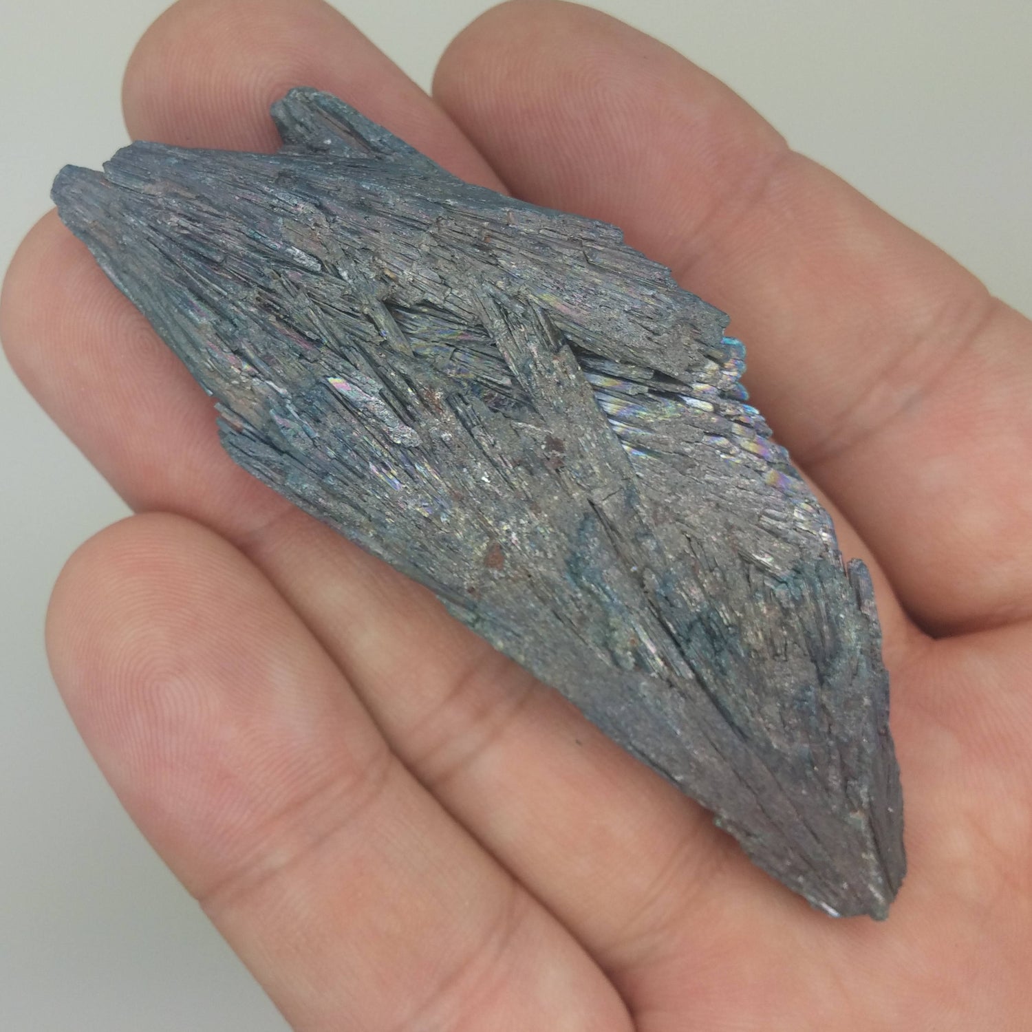 Opalized Aura Black kyanite has been treated with zircon via vacuum deposition to give an opalized look or rainbow sheen.