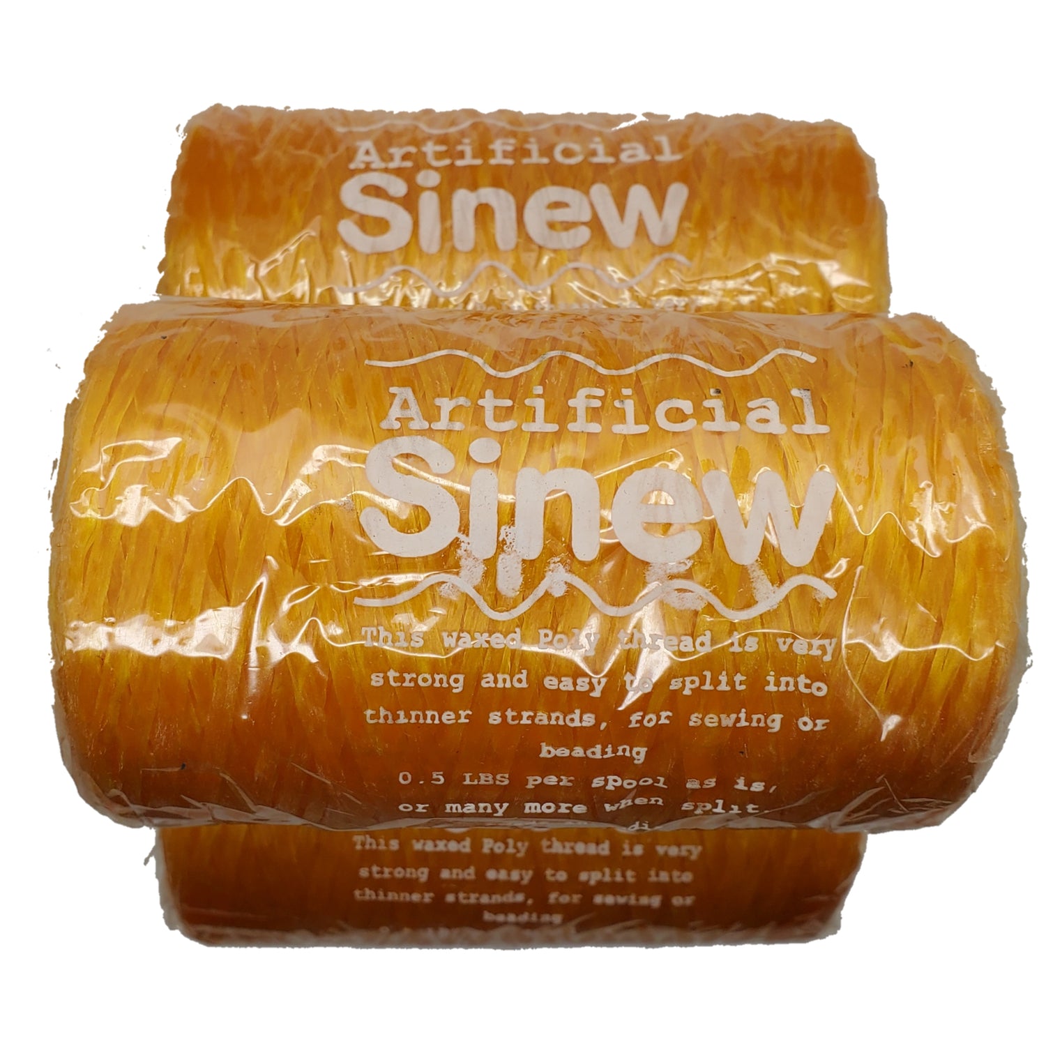 Artificial sinew is about 1/16th wide, is easily split into thinner strips and has a uniform waxy texture.