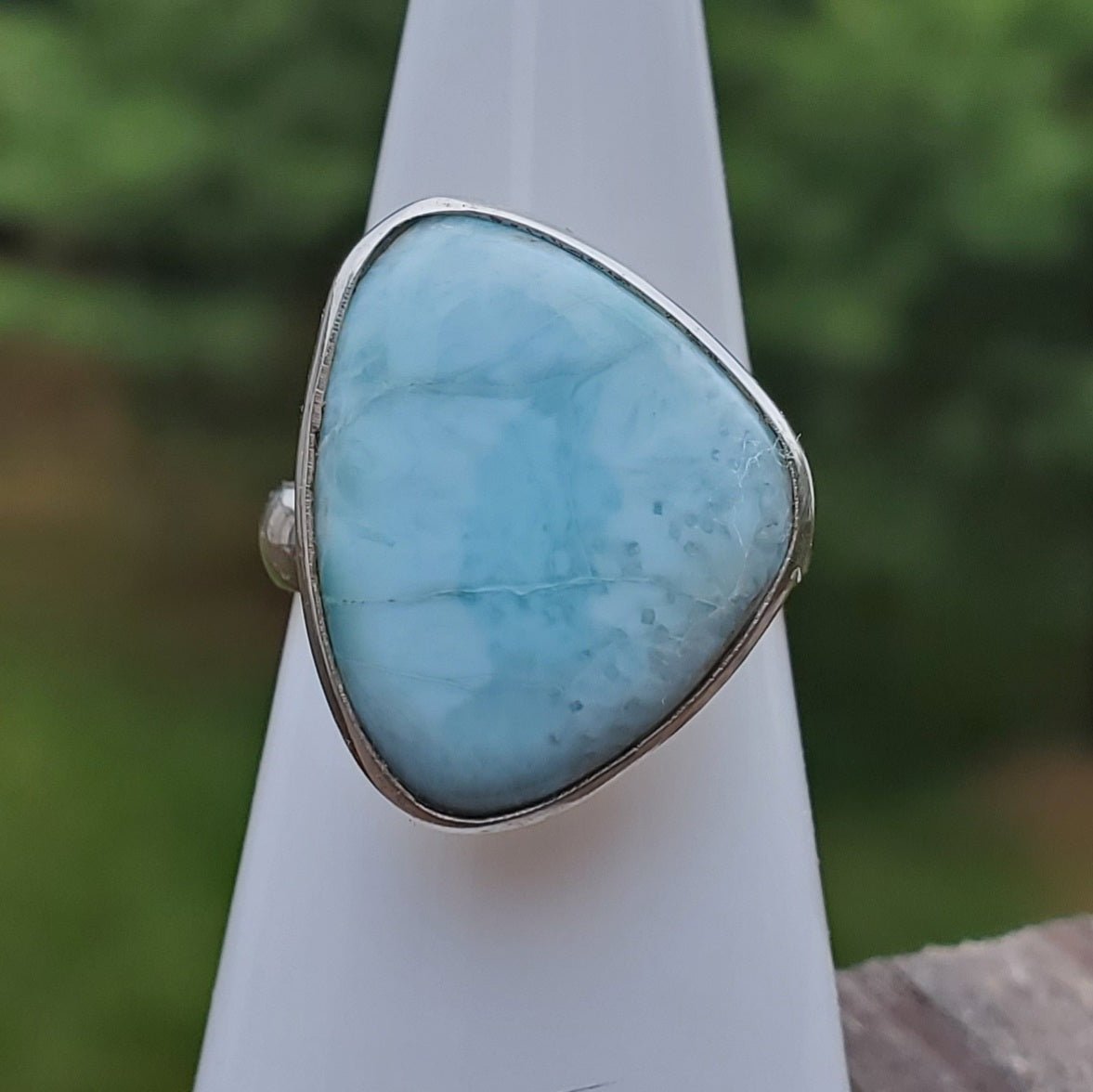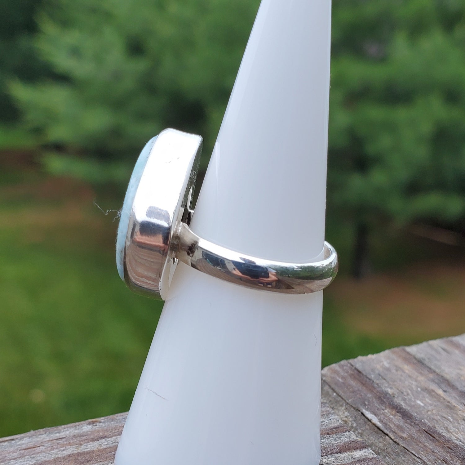 This Sterling Silver and Blue Turquoise Gemstone Ring is set simply and esthetically with a Celtic style.