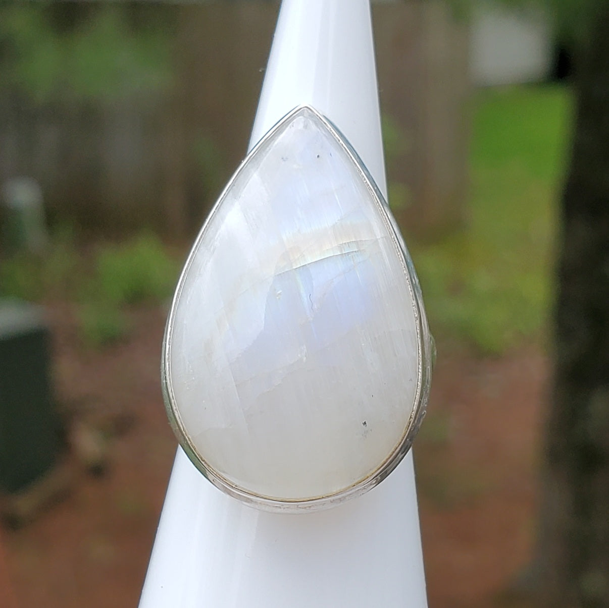 This Sterling Silver and Rainbow Moonstone Gemstone ring has a nice flash when looked at from a particular angle.