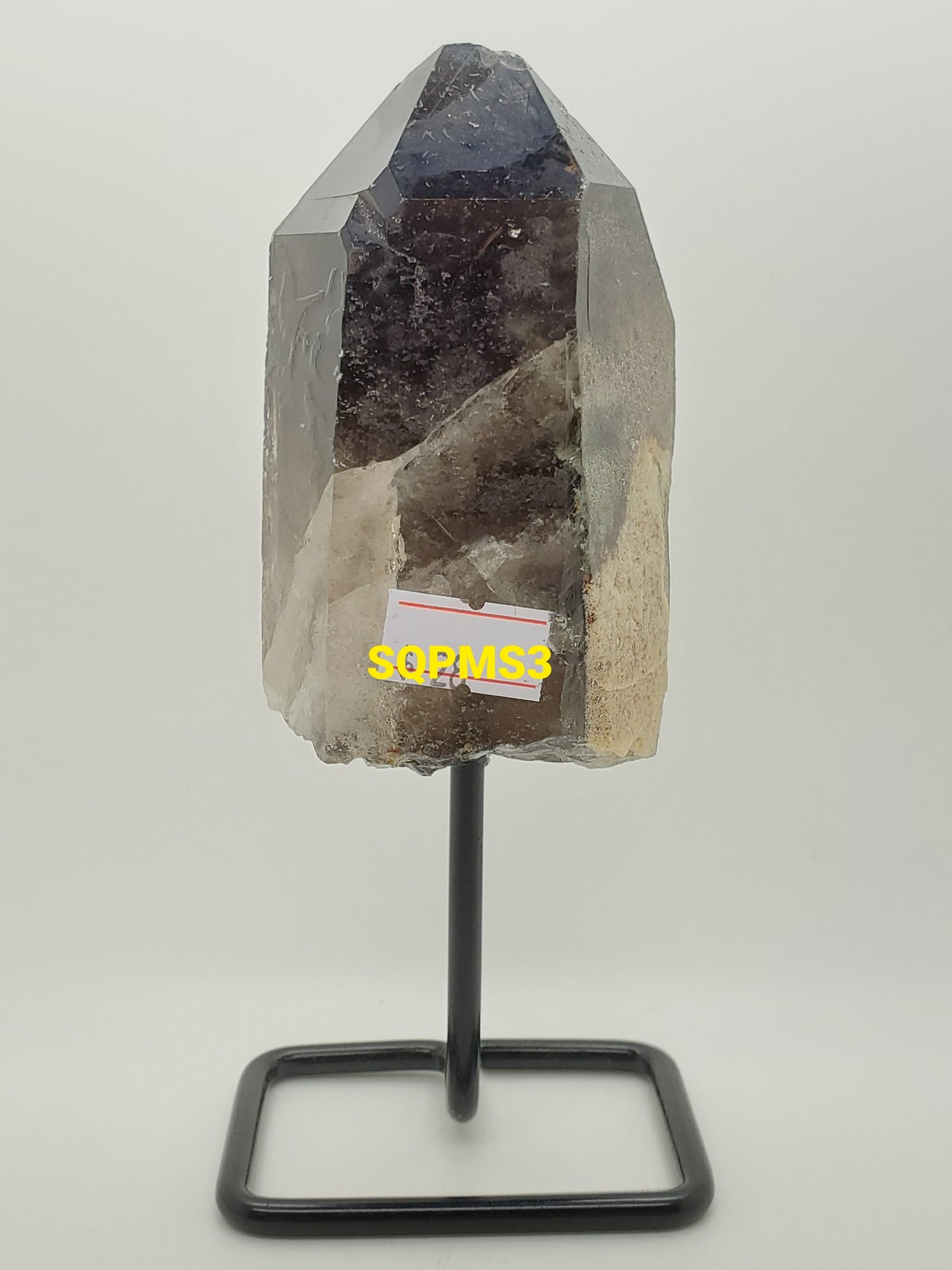 Natural Smokey Quartz Crystal Point on metal stand for home decor and display.