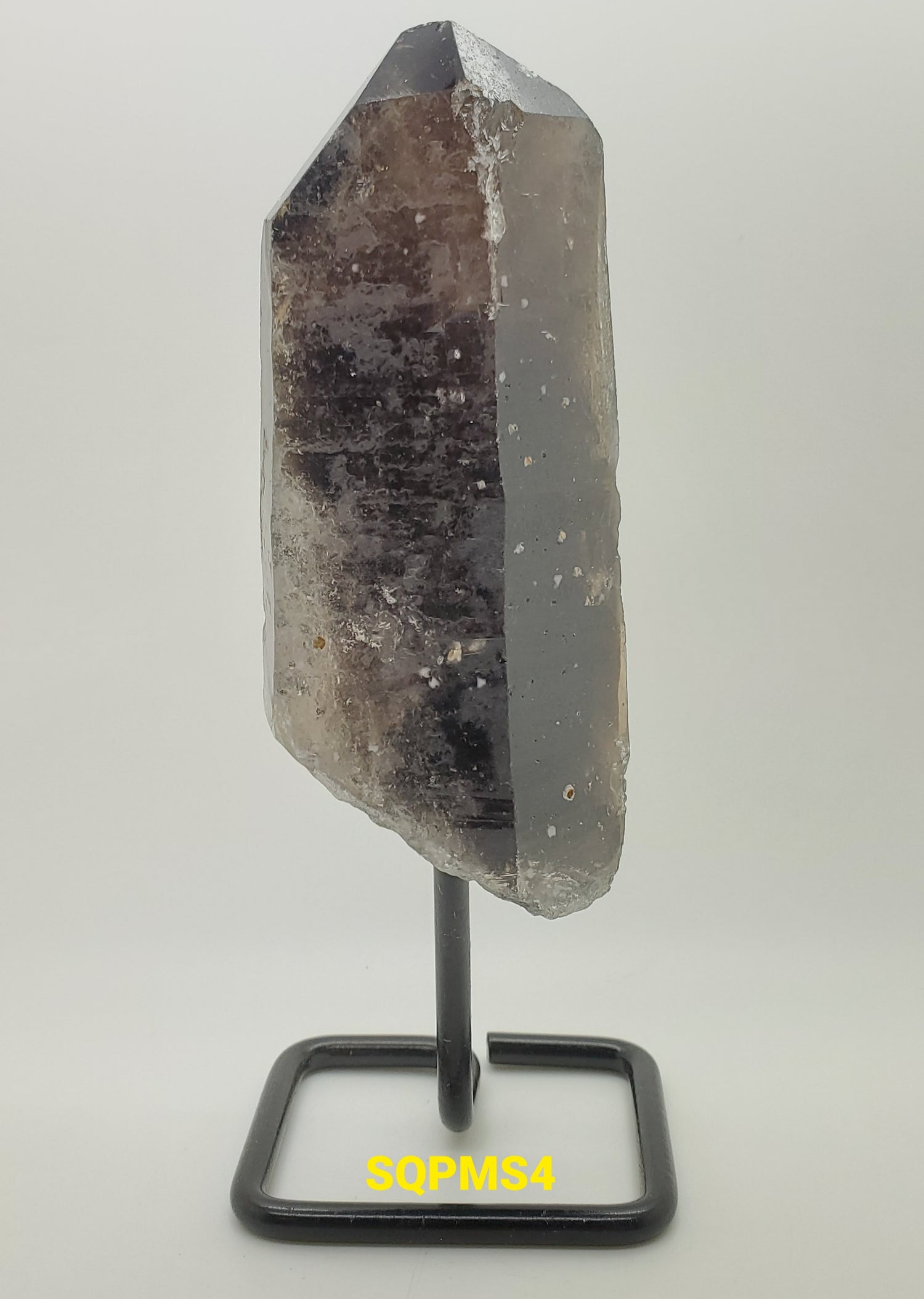 Natural Smokey Quartz Crystal Point on metal stand for home decor and display.