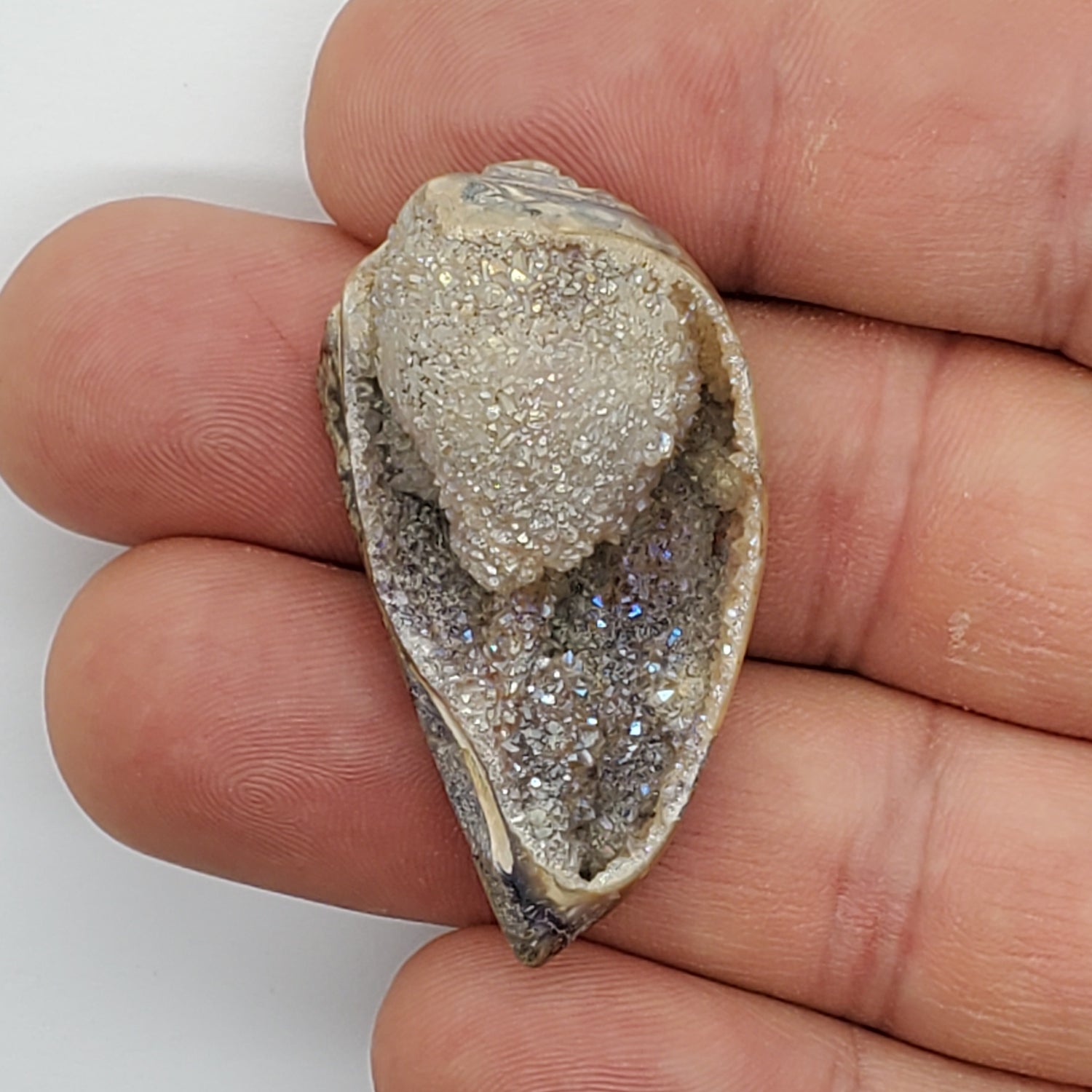 Spiralite gemshells are estimated to be over 5 million years old, each of these shell/geodes is the unusual left-hand coiling kind which is a rarity in the domain of shells. Left-hand turning shells are known as sinistra shells. Completely agatized and replaced by stunning quartz druzy in a myriad of colors and crystal types making each one a unique and desirable gem that treads the boundary between fossil and crystal.