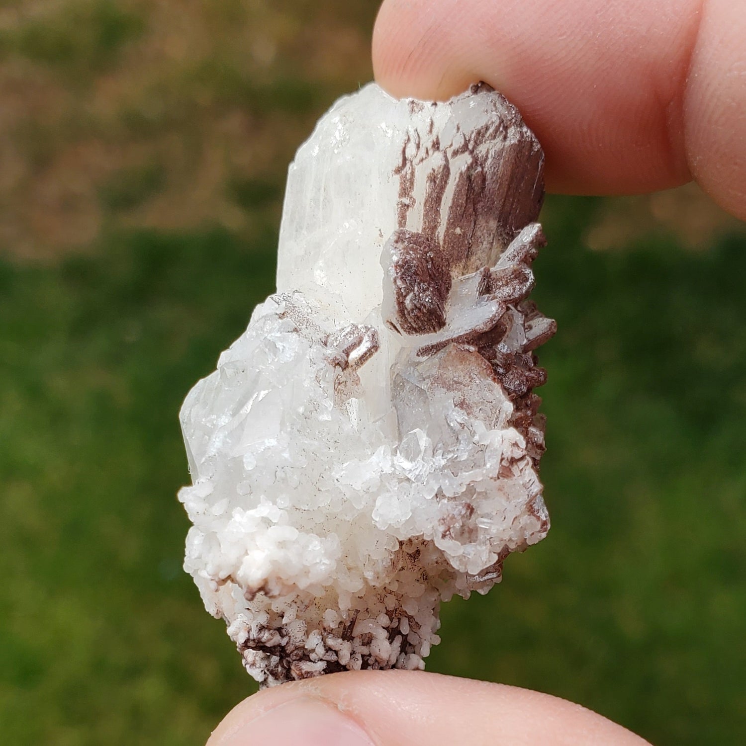 A dynamic appearance with brown mineralization on the Stilbite among the Apophyllite crystals.